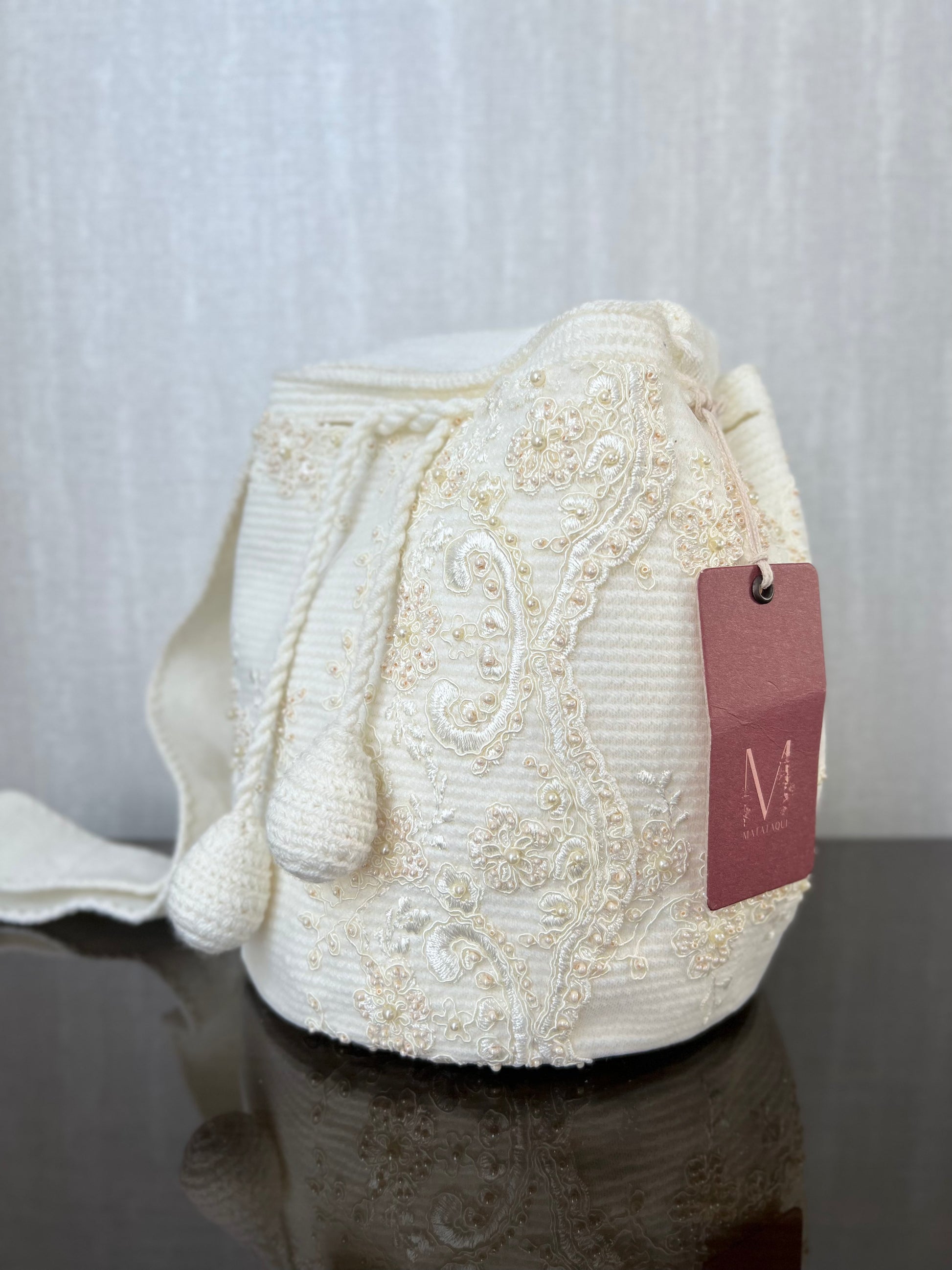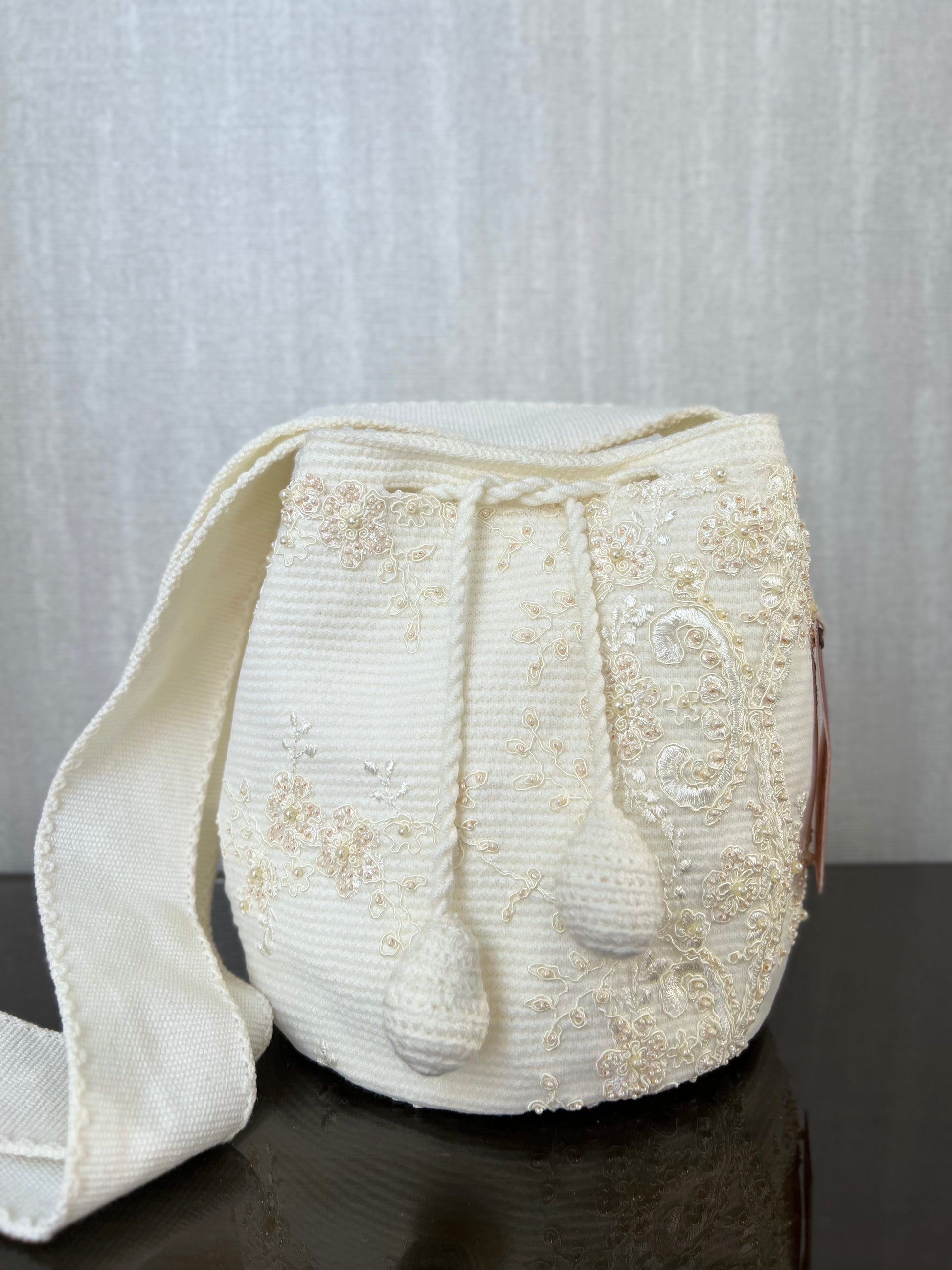 Eleva tu estilo con nuestra mochila Wayuu decorada, una obra 100% hecha a mano. Destacan los detalles bordados, flores y ramas en un elegante blanco perlado, realzados por delicadas perlas. Su versátil color la convierte en la elección perfecta para quienes buscan una mochila que complemente cualquier conjunto.